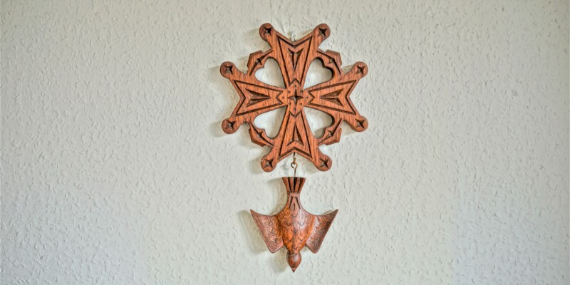 Dit symbool bestaat uit een Malthezer kruis en een duif (Heilige Geest). Aan dit kruis zijn aan de uiteinden acht knoppen. Deze staan voor de acht zaligsprekingen. Deze vormen een inclusie. Dat wil zeggen: ze worden door een overeenkomend begin en slot ingesloten, in dit geval: voor hen is het Koninkrijk van de hemelen. Jezus spreekt hier, in zijn zogenoemde Bergrede, met name de toegestroomde menigte toe. In vers 11 richt Jezus zich in een nieuwe zaligspreking met name tot zijn leerlingen. Het viel mij op dat zowel het in de vierde als in de achtste zaligspreking gaat om hen die gerechtigheid najagen. Mogelijk mogen we zo in deze acht zaligsprekingen een tweedeling zien: twee maal vier zaligsprekingen.